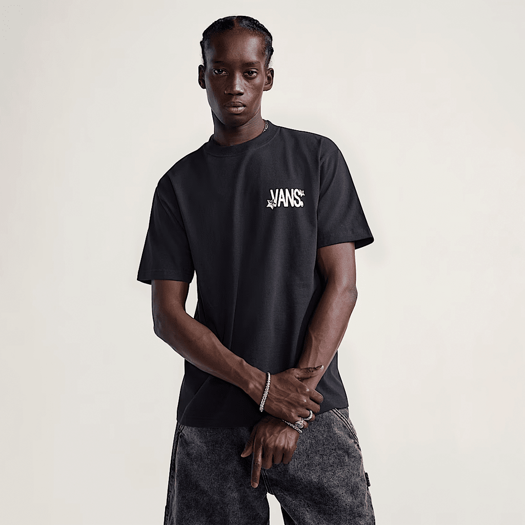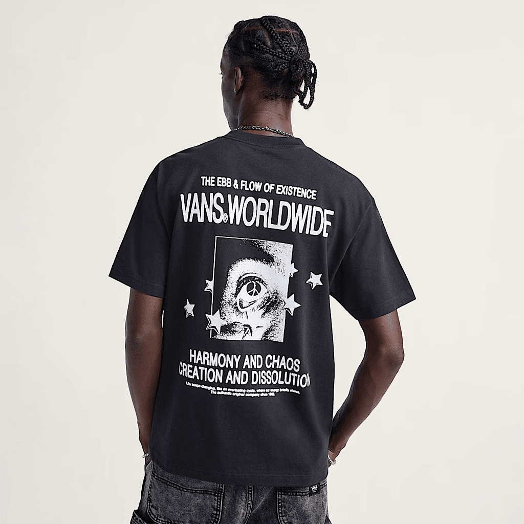 Embrace the meaning of existence in the Chaos T-Shirt, a classic crew neck with short sleeves for a casual, everyday style. It's topped with screen print artwork for a long-lasting design, featuring a Vans logo on the front, and a star-studded homage to the wildness of creation on the back.