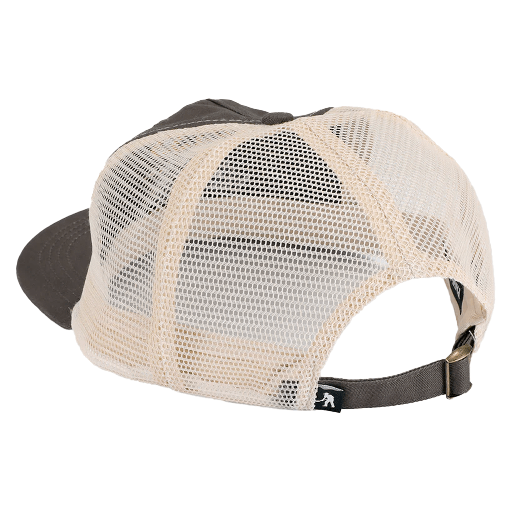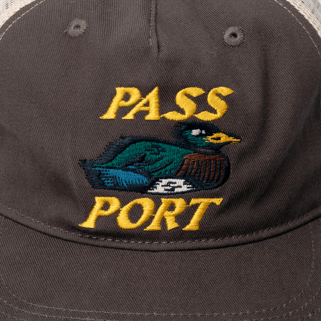 The Pass~Port cap is made from heavy cotton twill and recycled polyester mesh backing. This trucker cap features adjustable strapback with brass buckle and has direct embroidery on front.
