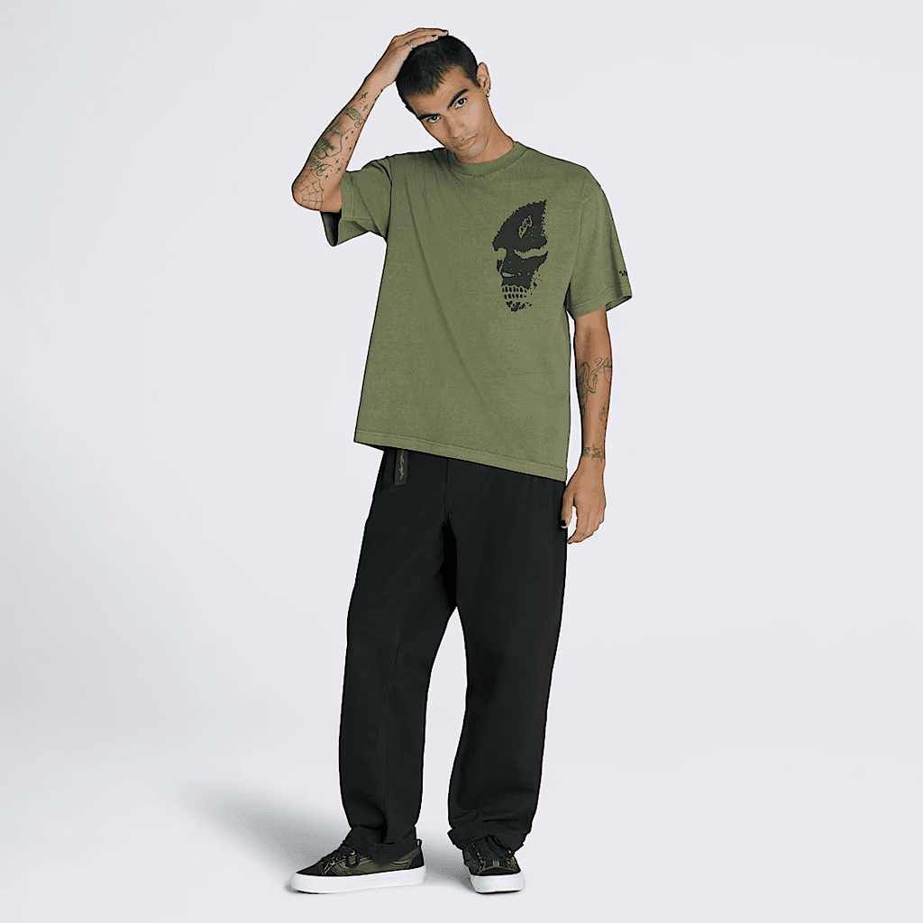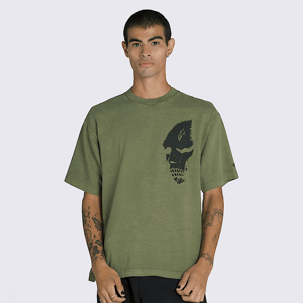 Created by artist, designer and skateboarder Mike Gigliotti, the Skate Mike Gigliotti Tribal T-Shirt is cropped, short sleeve crew neck T-shirt in a loose fit. It features a screenprinted graphic of a skull designed by Gigliotti, accented with 5-Checkerboard embroidery details and a Vans® skateboarding label package.