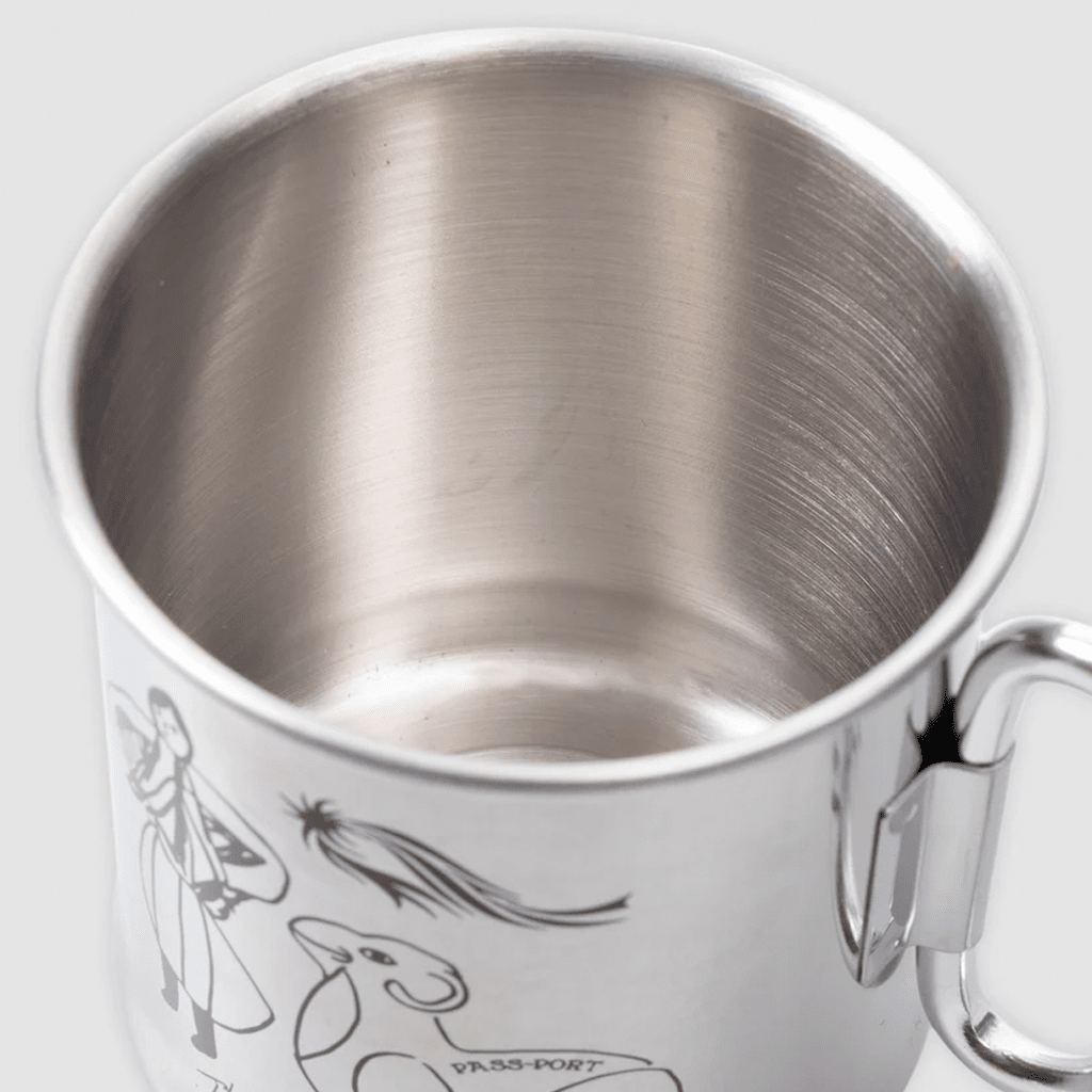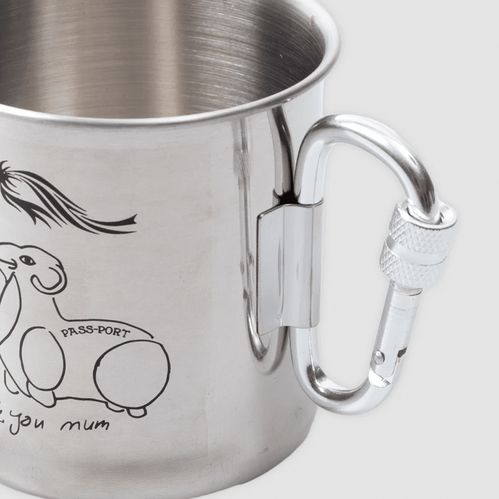 The carabiner mug is a stainless steel camp mug with built in carabiner handle and printed artwork by Shanon Rush.