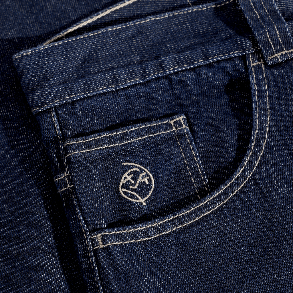 Low-waisted baggy jeans with tapered legs. Made from 100% indigo cotton denim with a heavyweight 435 gsm feel. Features a YKK zipper, custom YKK button, and embroidered detail on the change pocket. Finished with a woven label on the waist.