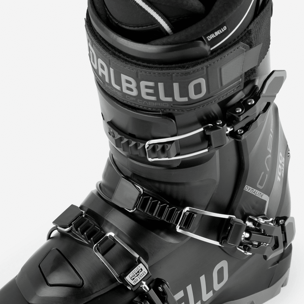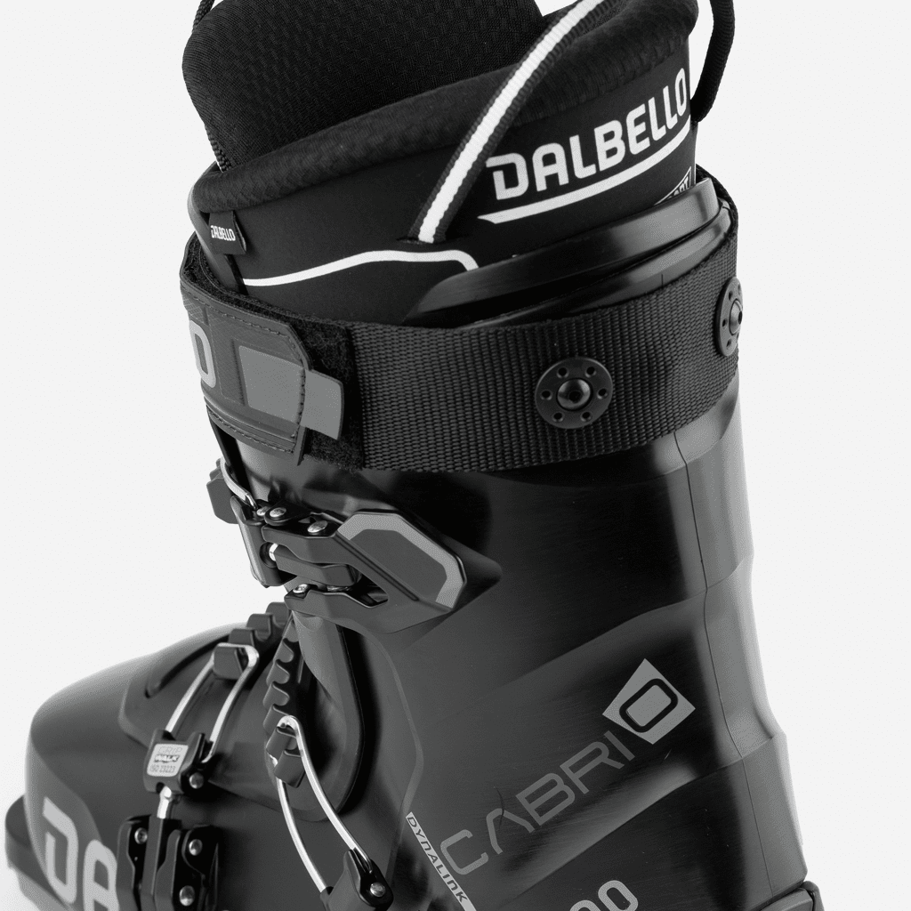 The IF (Instant Fit) SPORT liner, with integrated padding and tongue, also enhances heel hold and efficiently transfers control inputs to the shell, thanks to a partially reinforced outer layer. Rounded off with additional thoughtful features, including adjustable forward lean (12° or 14°) with an insert in the upper heel area and a redesigned tongue profile for optimized ergonomics and more rebound, this boot is designed for maximum performance. A precisely positioned 45-degree buckle as part of the Dalbello Dynalock closure system contributes to the optimal fit of the boot. The buckle design also simplifies the handling of the Cabrio MV 100.