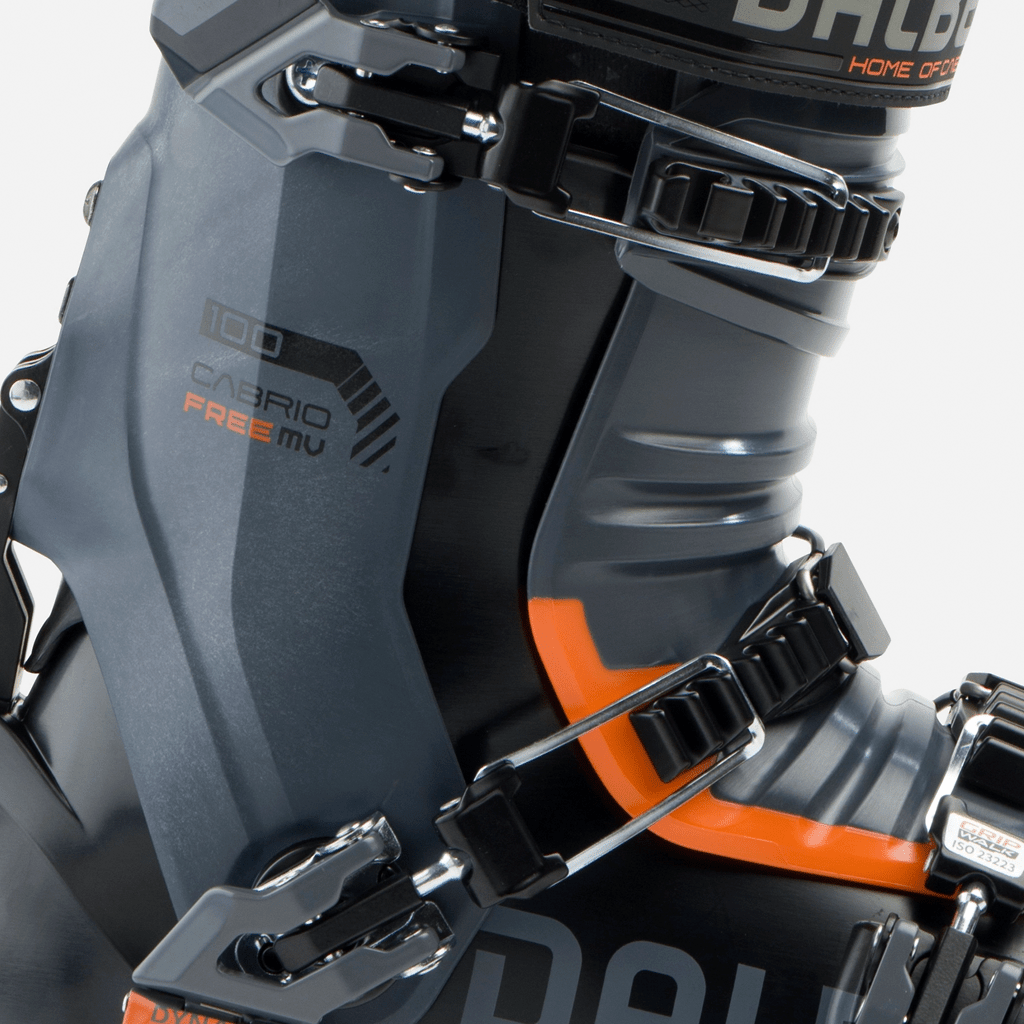 The Cabrio MV Free 100 IF with a 100 flex was developed for freetouring enthusiasts who appreciate various skiing abilities and walkability options. The boot features a wider 101 mm last (MV stands for “Medium Volume”), offering the best fit for skiers with wider feet or those who prefer more volume. The IF (Instant fit) HIKE MV liner, specially designed for 'Medium Volume' boots, provides added comfort and direct contact with the foot. The liner consists of separately manufactured, partially pre-shaped components, with slightly softer materials around the ankle and forefoot. The Cabrio design, which lends its name to the boots, allows for controlled descents in various terrain. The three-piece construction enables even flex, harmonious cushioning and stable lateral and heel support. The bi-injected tongue is crafted with softer plastic at key flex points for easier walking, further supported by thinner tongue ribs. Another feature of the uphill package is the Ski-Walk mechanism, which adjusts to the cuff's angle with a curved interaction surface, automatically regulating lateral inclination.