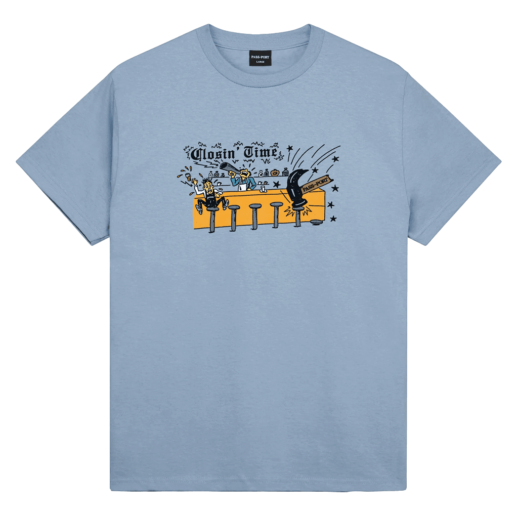 The Pass-Port Closin' Time tee in washed out blue is made from 100% cotton and features a screen printed front. It offers the signature Pass-Port fit.