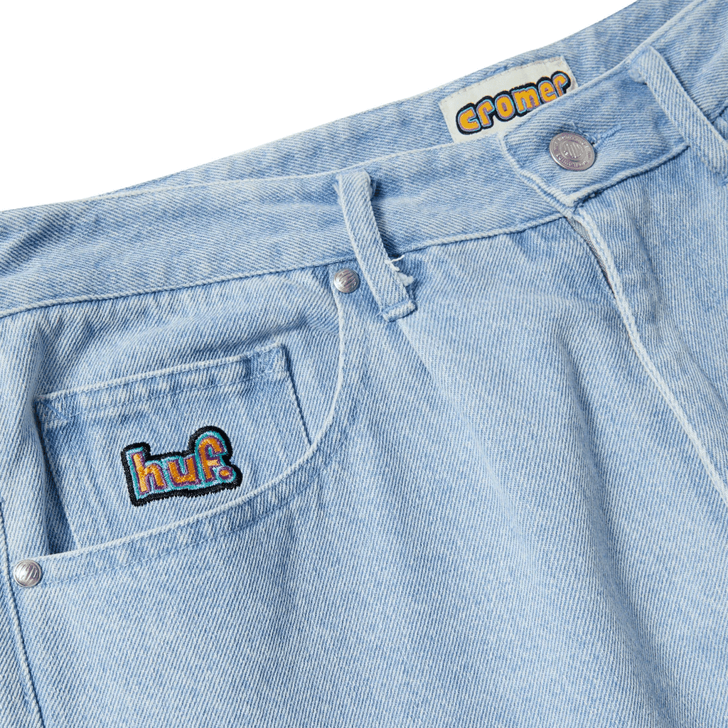 The Cromer Signature Pant is designed in collaboration with HUF team rider Brad Cromer for a '90s-inspired baggy jean combining all aspects of Brad's favorite pants. Made of heavy-duty cotton denim, this everyday skate pant is reinforced at critical seams and features an embroidered HUF logo at the coin pocket, a Cromer label at the waistband, and a generous taper at the leg.