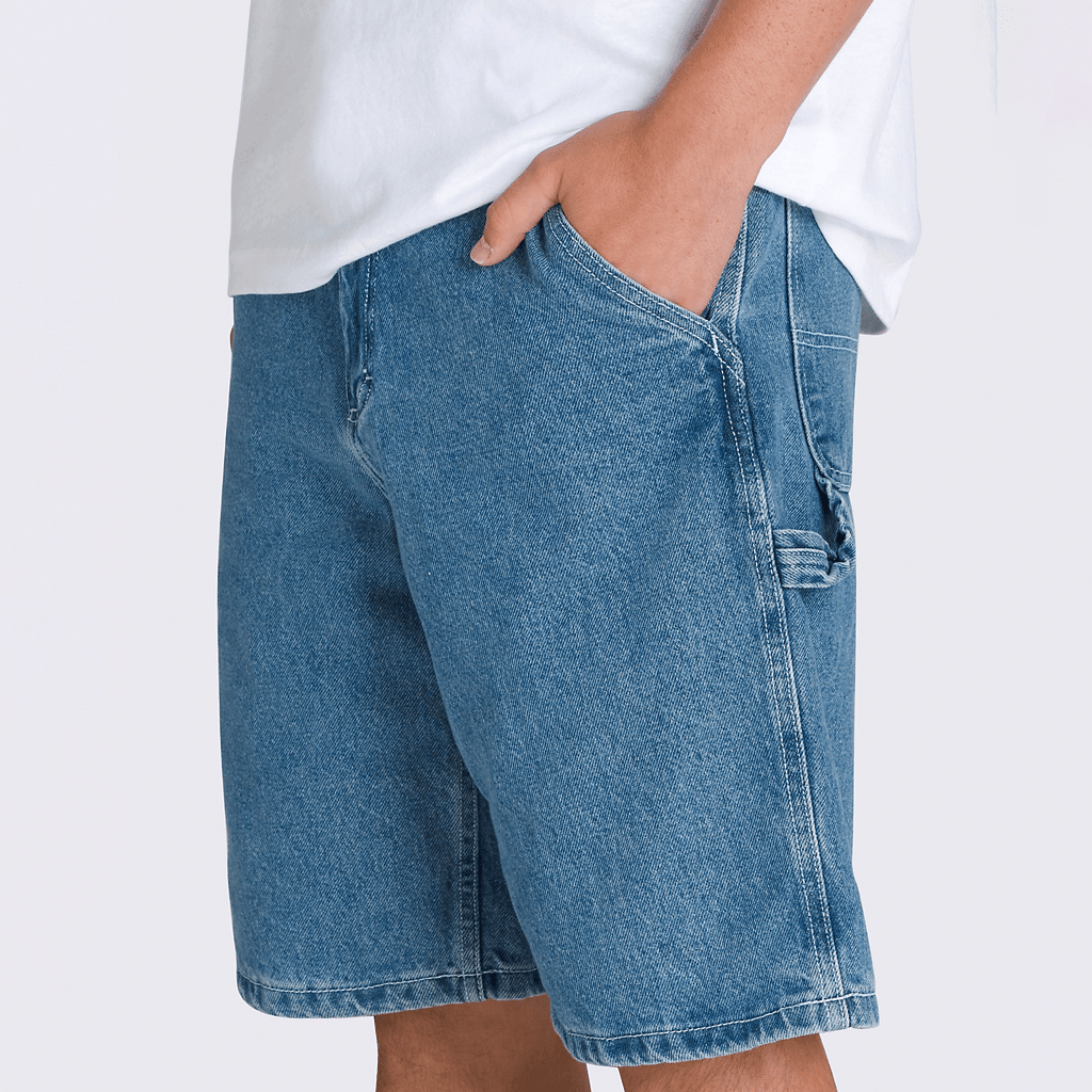 The Drill Chore Loose Denim Short is made with heavyweight cotton denim and features traditional carpenter-style details, including a hammer loop and tool pocket on the right thigh. The loose fit adds to the old school, easygoing vibe. Model wearing size 32 or Medium.