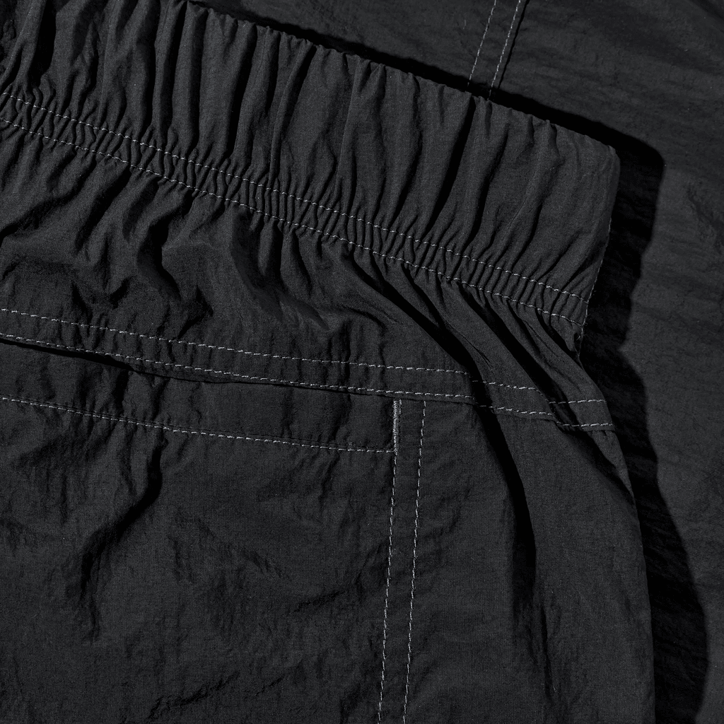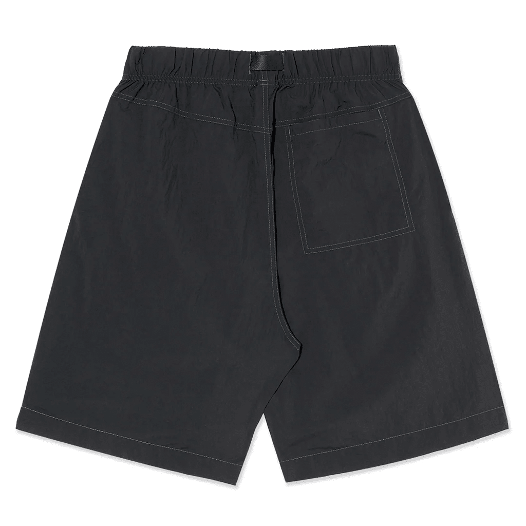 Shorts in vintage black, crafted from lightweight 85 gsm nylon with a slightly wrinkled texture. Contrast grey stitching with an elastic waistband and integrated belt with plastic buckle. Front fatigue-style patch pocket and hidden mesh key pocket with YKK zip. Back yoke with inseam welt pocket and grey surf logo embroidery, wide fit.