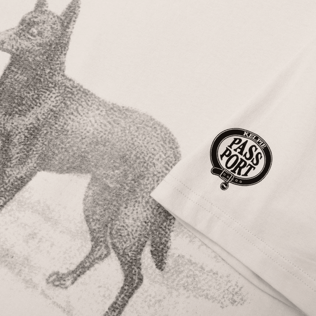 The Pass-Port Kelpie Tee in natural is made from 100% cotton and features a water-based screen print on front and sleeve. It offers the signature Pass-Port fit.