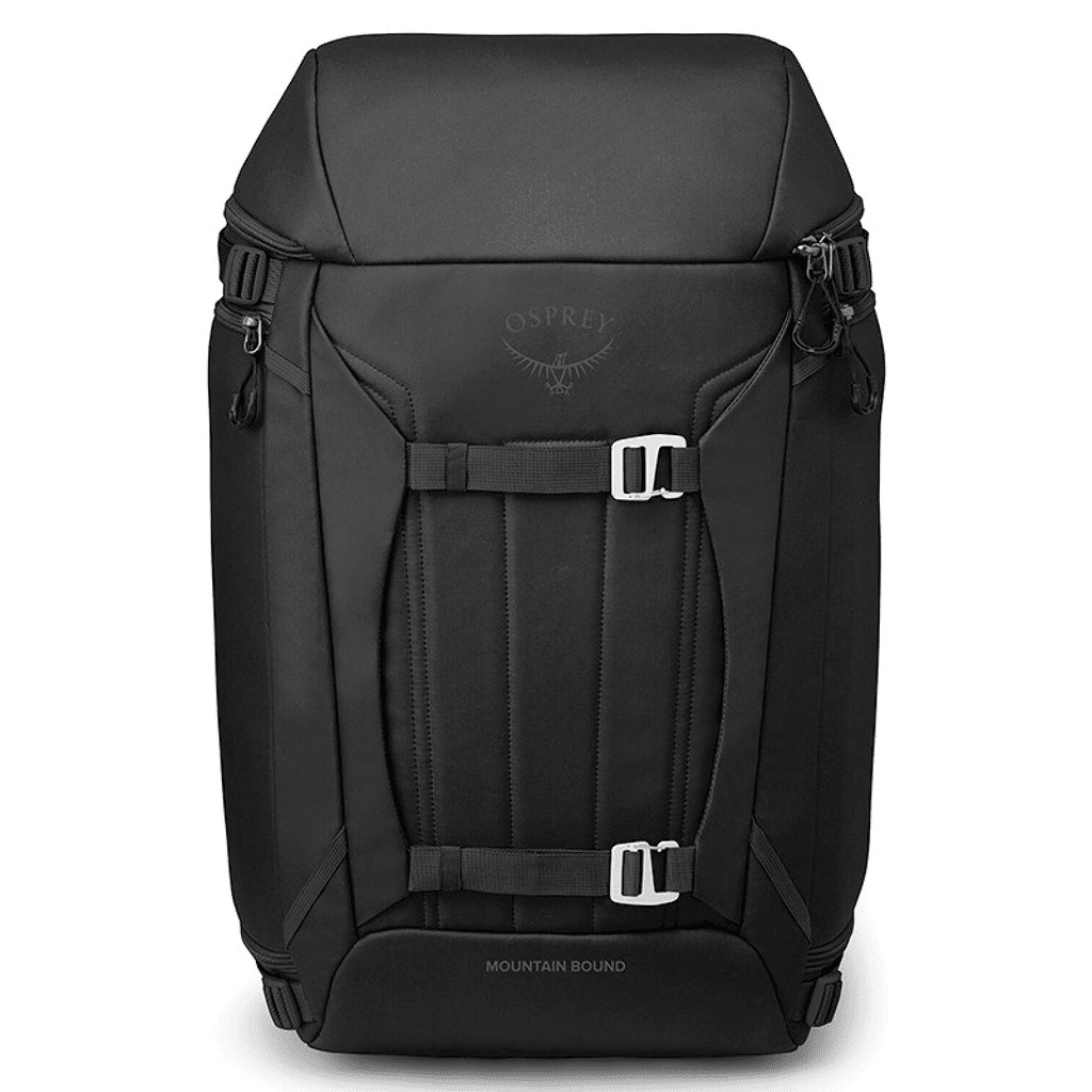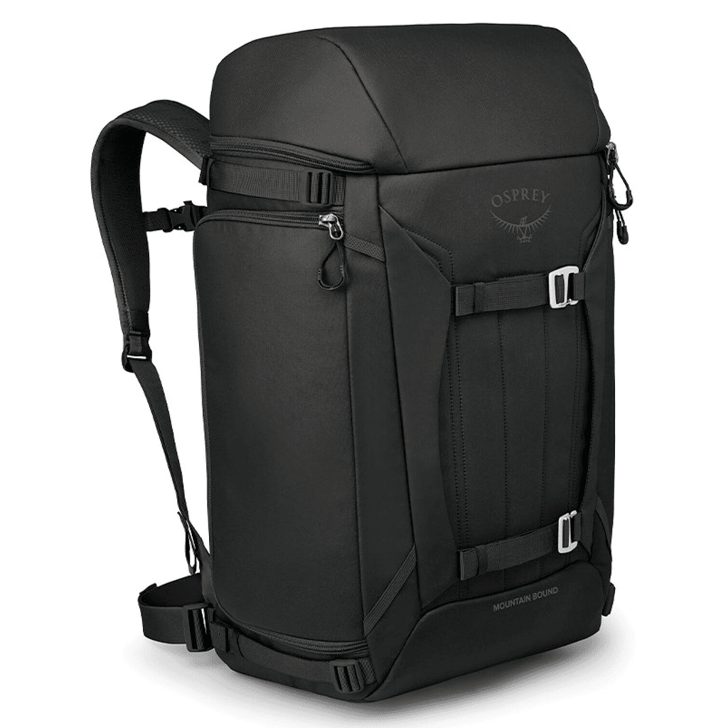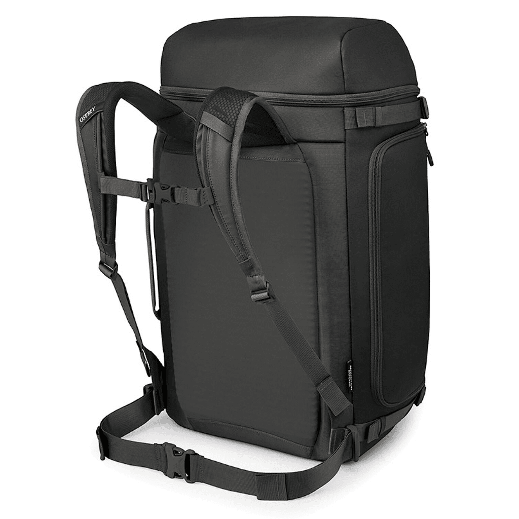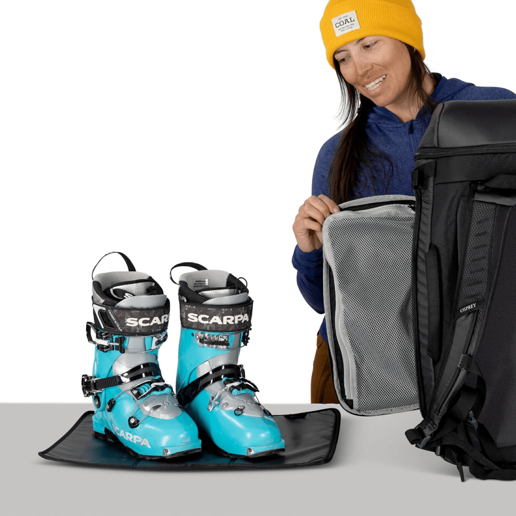Features Osprey’s AirScape™ suspension system with padded, ventilated harness straps for comfort when transporting boots and gear from the airport to the slopes.