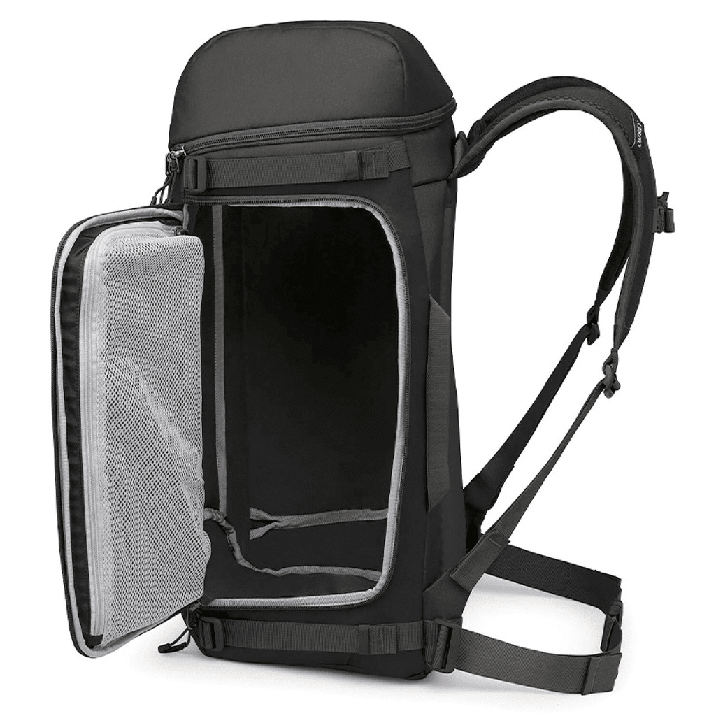 Dedicated compartments keep boots, helmet, goggles, and accessories separate. Includes a padded changing mat for taking off boots comfortably in the parking lot.