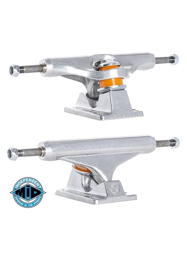 New Independent MiD trucks feature a lower profile hanger for optimal contact point angle on your nose and tail for flip tricks, ledges, and all-around street skating with a recommended wheel size of 53mm and under. The newly designed and first ever Independent inverted kingpin can be used with either a 5.5mm Allen key or standard 9/16" hex wrench. The innovative new Shaft Nut in the baseplate creates a rigid and durable solution to lateral movement found in most inverted kingpin designs and increases adjustability.