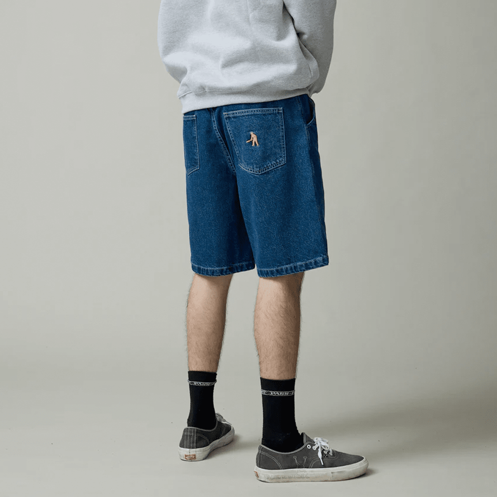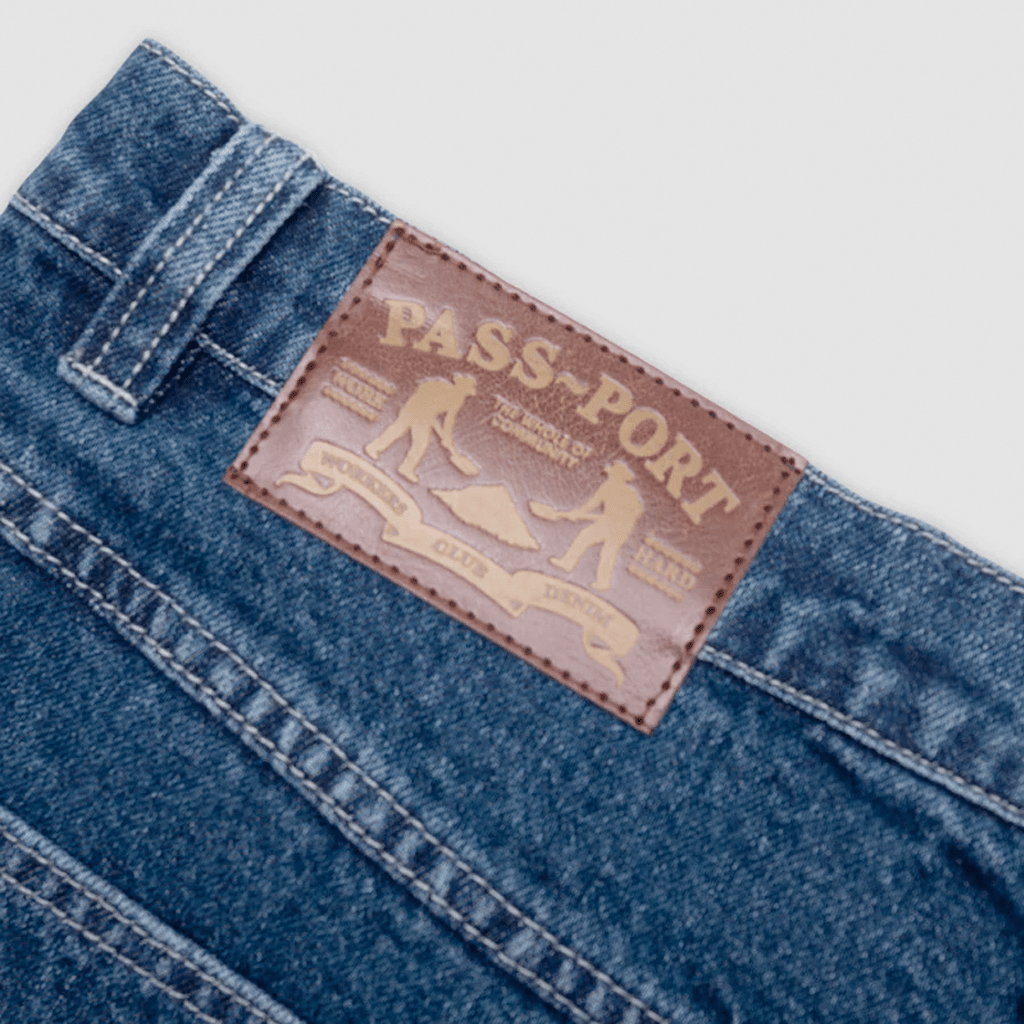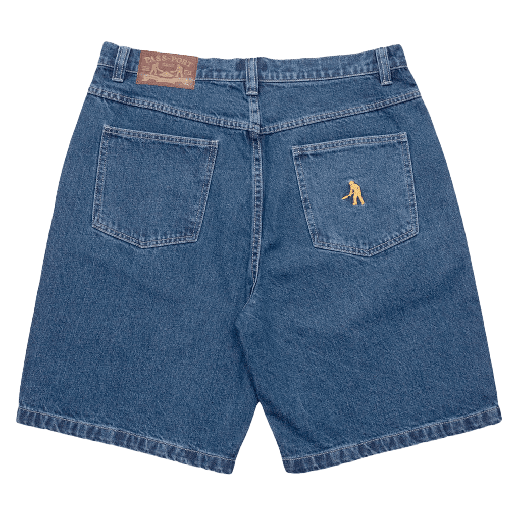 Pass~Port Workers Club denim short from range #43. The Workers denim shorts is made from 100% cotton 16oz rigid denim and fine yarn for extra strength. The denim jean features silver contrast stitching, digger embroidery on back pocket as well a faux leather label on waist.
