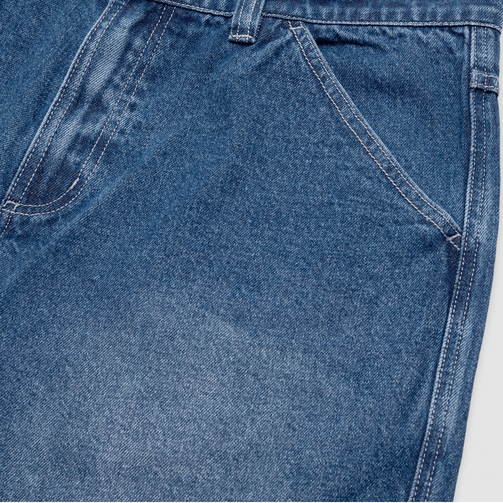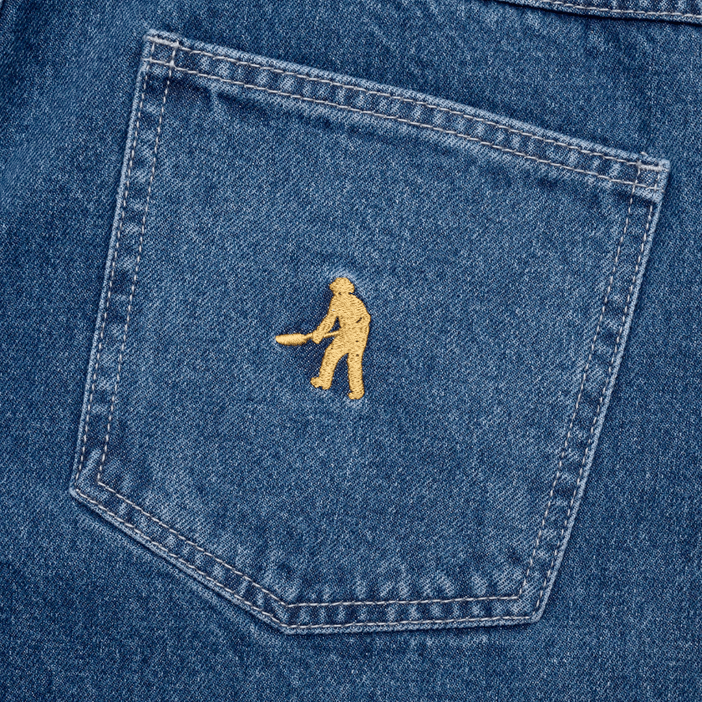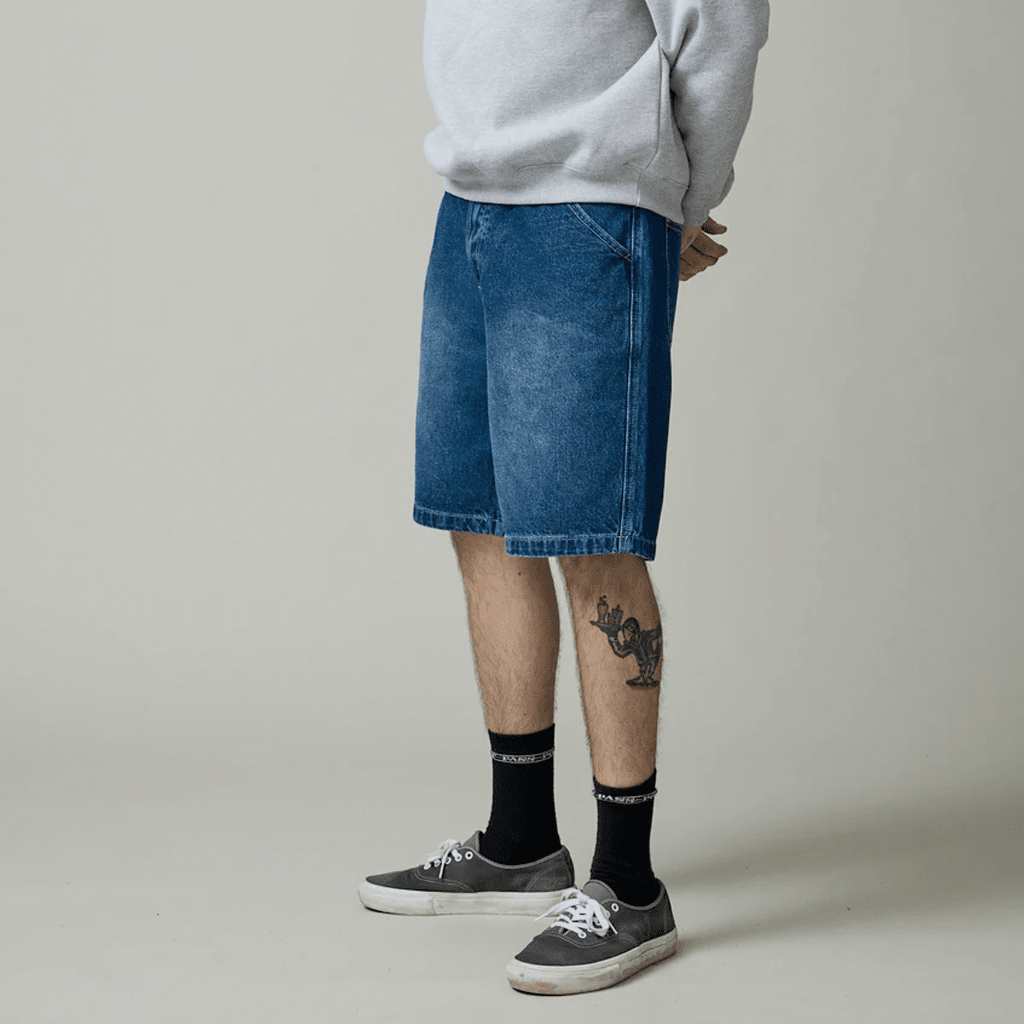 Pass~Port Workers Club denim short from range #43. The Workers denim shorts is made from 100% cotton 16oz rigid denim and fine yarn for extra strength. The denim jean features silver contrast stitching, digger embroidery on back pocket as well a faux leather label on waist.